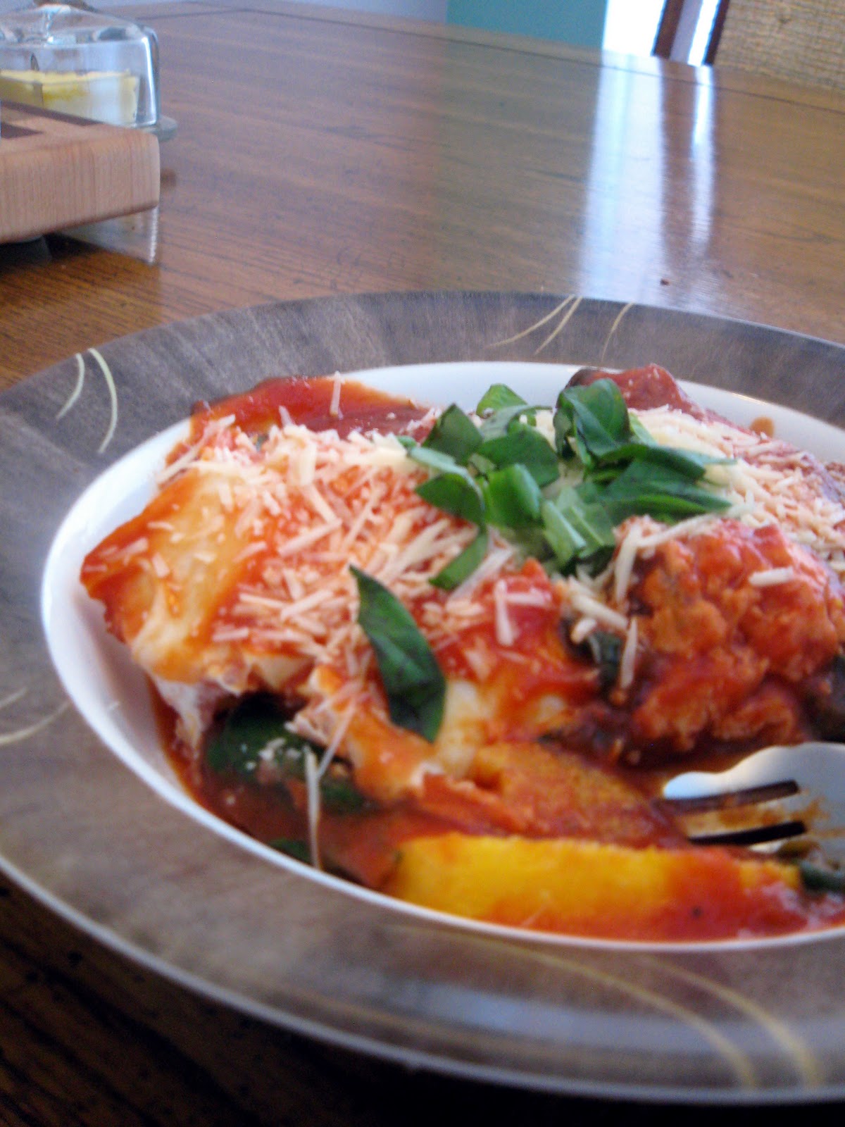 2) Meanwhile bring your sauce to a simmer in a large skillet. Add the spinach. Cover and cook for 1-2 minutes until the spinach has wilted. Make 4-8 (depending on how many eggs you are using) indentations in the spinach mixture with the back of a spoon. Carefully crack an egg into each indentation. Reduce heat a little and cover. Let eggs cook about 5-7 minutes till they are the desired doneness. Serve by placing 3 polenta rounds in a dish. Spoon the spinach mixture over each round and top with one or two eggs. Sprinkle with Parmesan and basil and serve.