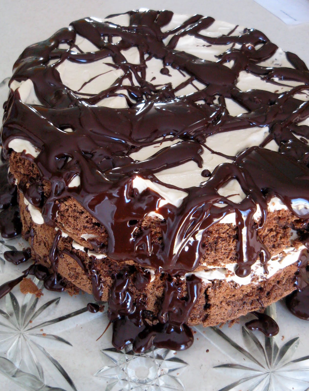 6) To assemble the cake place a layer of cake on a platter or cake stand. Top with 1/4 of the filling mixture spreading it to the edges of the layer. Add another layer of cake and another 1/4 of the filling until all layers of the cake are on. Top with the remaining 1/4 of the filling mixture and the drizzle with chocolate ganache (recipe follows).