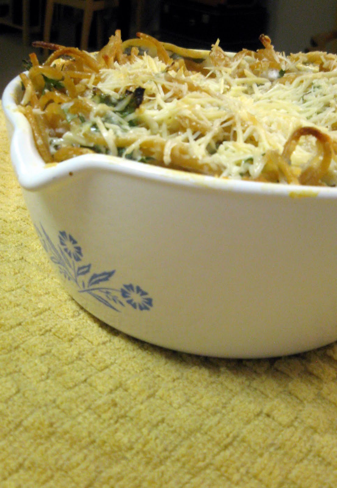2) Meanwhile in a separate bowl combine the olive oil, garlic, lemon juice, lemon zest, Greek yogurt, parsley, salt and pepper. Toss spaghetti with this mixture and put into a oven proof dish that has been sprayed with non-stick spray. Sprinkle on top with Parmesan and then bake for 15-17 minutes.