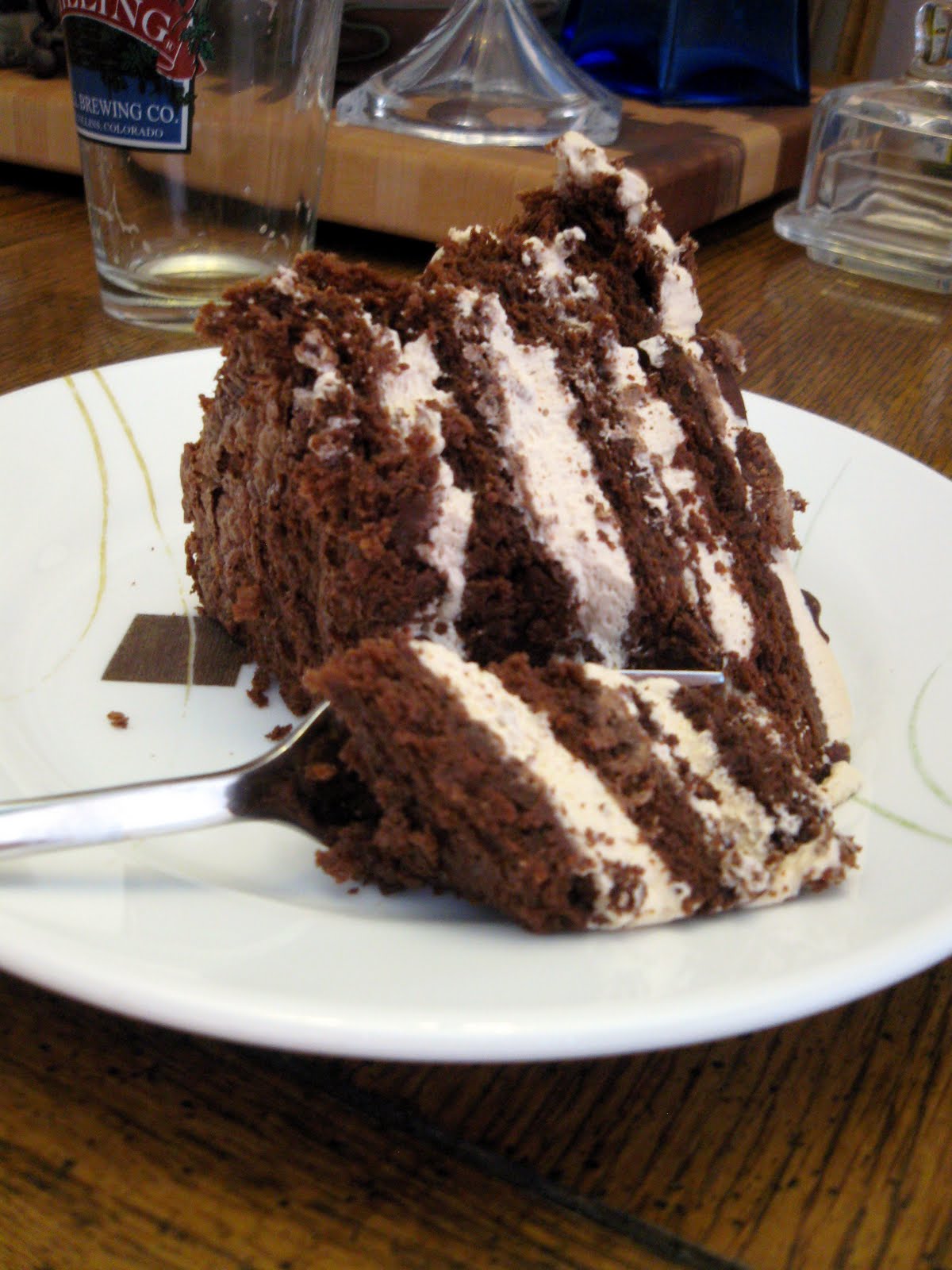 What resulted was a total winner. It was so light and moist and had a wonderful rich chocolate flavor. We used coffee flavored whipped cream filling and chocolate ganache to finish it off. While Jason and Cassie's dad did the work on the house, Cassie set about assembling the cake. She made the cake in two batches since we only had 2 9-inch round cake pans. You can't let the batter sit for long since it consists of mostly beaten eggs. Also she practically had to fight her mom off with a stick so she could get a picture of the cake before she started sticking her fingers in the ganache and the coffee filling.